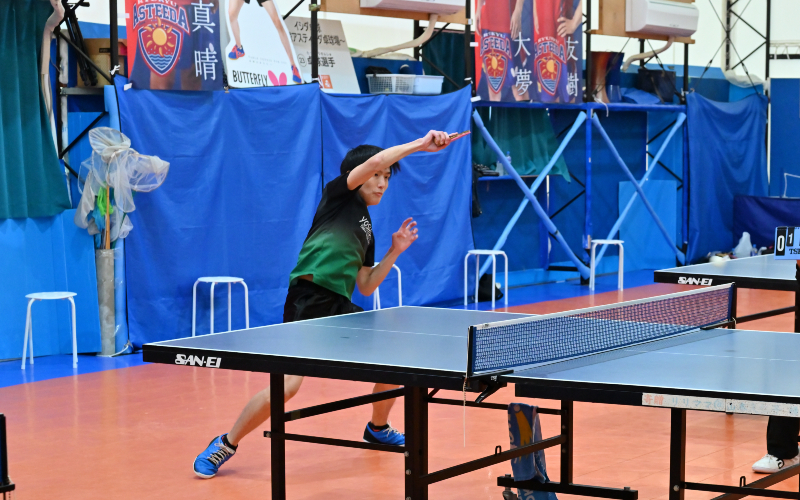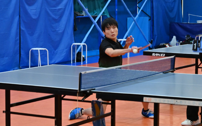 (素早いフットワークで回り込みフォアドライブを打つ森岡選手)