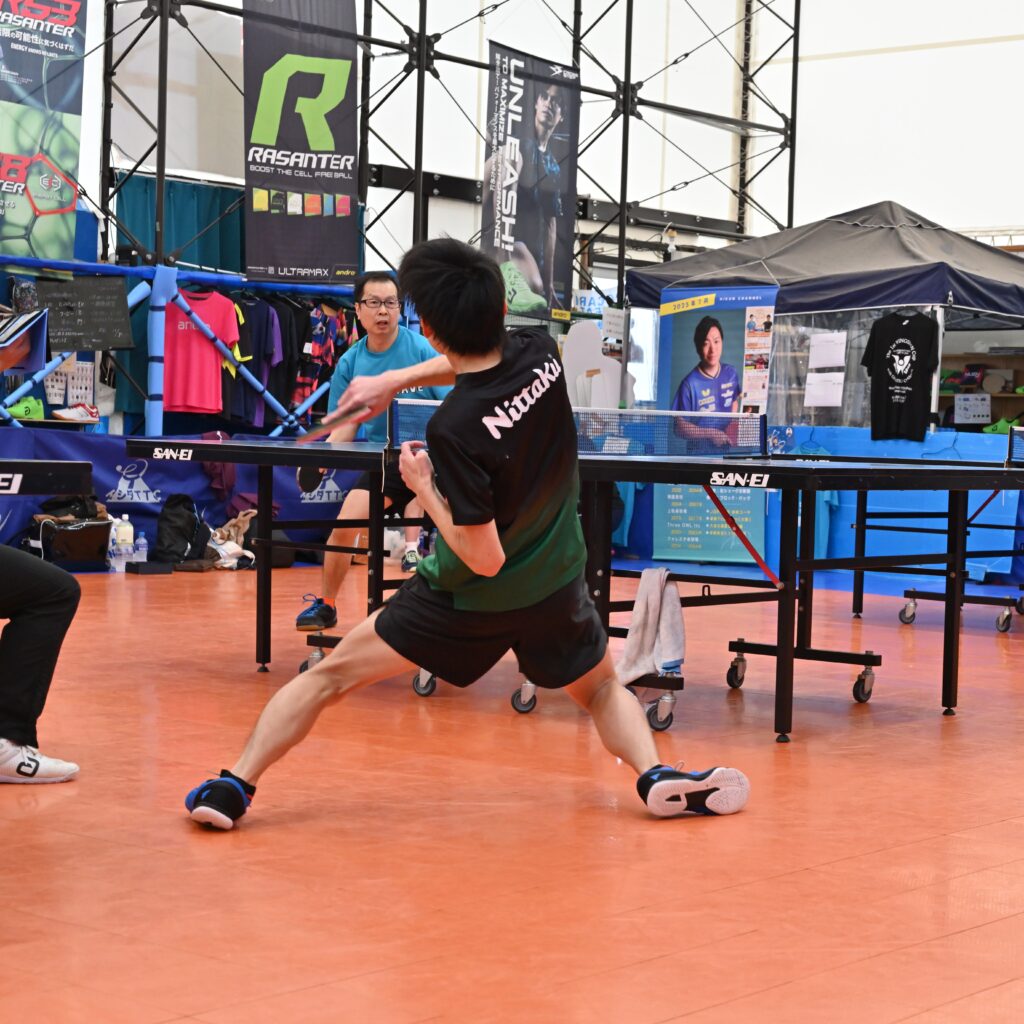 すでにWRMさんの動画、WRM-TVにも出演されている森岡亮選手(吉田卓球場:兵庫県)は、動画タイトルにもあるように「最強のWINGSPAN使い」として弊社ラケット愛好者には知られた存在であり、本大会における優勝候補だった。